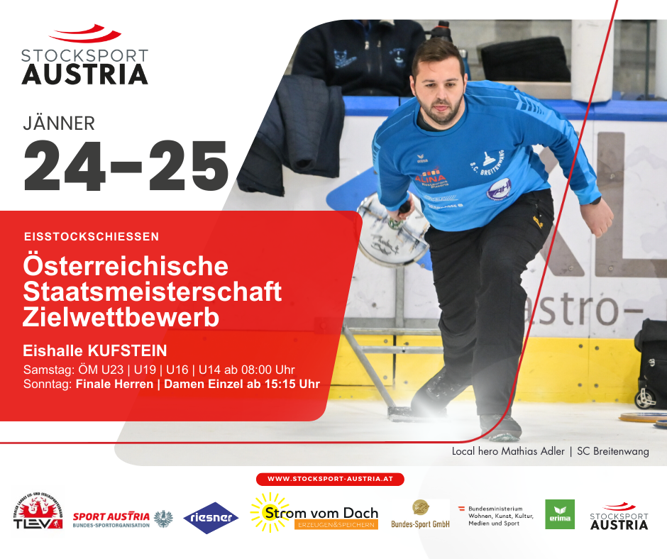 In der Eishalle Kufstein finden am 24. und 25. Jänner 2026 die Österreichischen Staatsmeisterschaften im Zielwettbewerb in allen Klassen statt. Im vergangenen Jahr in Kapfenberg sicherten sich Verena Gotzler und Patrick Solböck die Titel. Auch heuer gehen beide als Favoriten ins Rennen – für beide wäre es bereits der dritte Einzeltitel bei Österreichischen Staatsmeisterschaften. Der Samstag steht ganz im Zeichen des Nachwuchses. In den Klassen U14, U16, U19 und U23 kämpfen Österreichs größte Talente nicht nur um den Österreichischen Meistertitel, sondern auch um die Qualifikation für die Europameisterschaften Anfang März in Inzell (GER). Am Sonntag folgen die Bewerbe der Senioren, Damen und Herren sowie die Mannschaftswertungen.